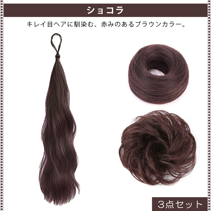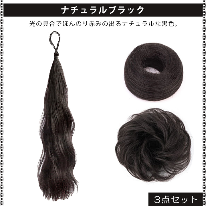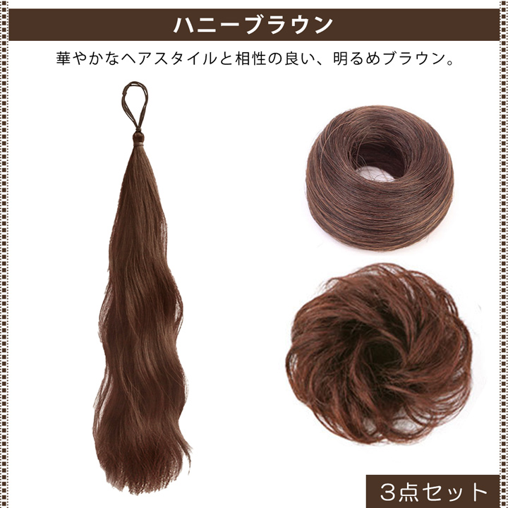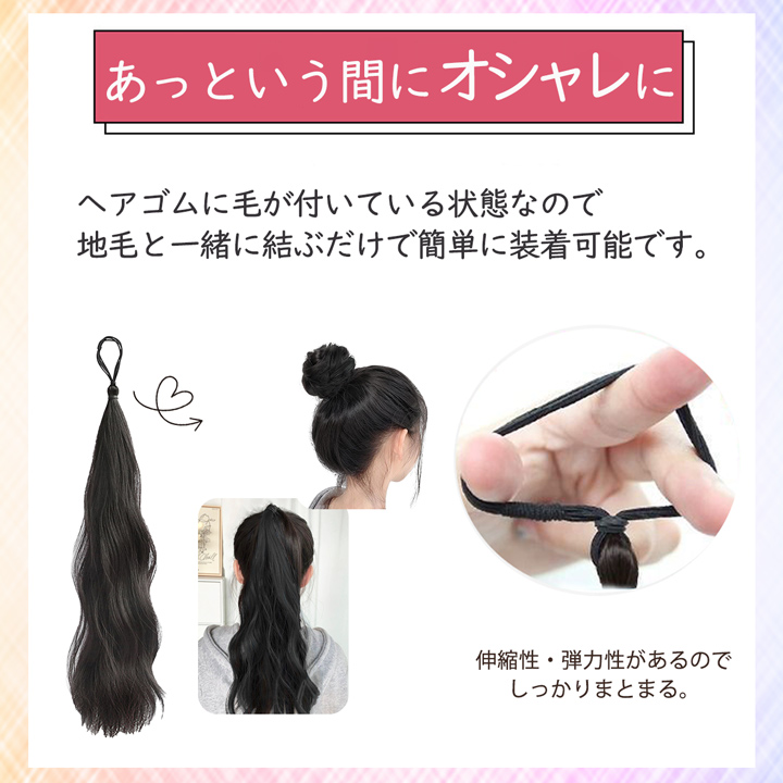 | スペック | 【へアゴムタイプ】 長さ約50cm/重さ約55g 【シュシュタイプ(ストレート)】 直径約6cm/厚み約2cm/重さ約15g 【シュシュタイプ(ウェーブ)】 直径約12cm/厚み約3cm/重さ約25g (平置き採寸のため若干の誤差はご了承ください) |