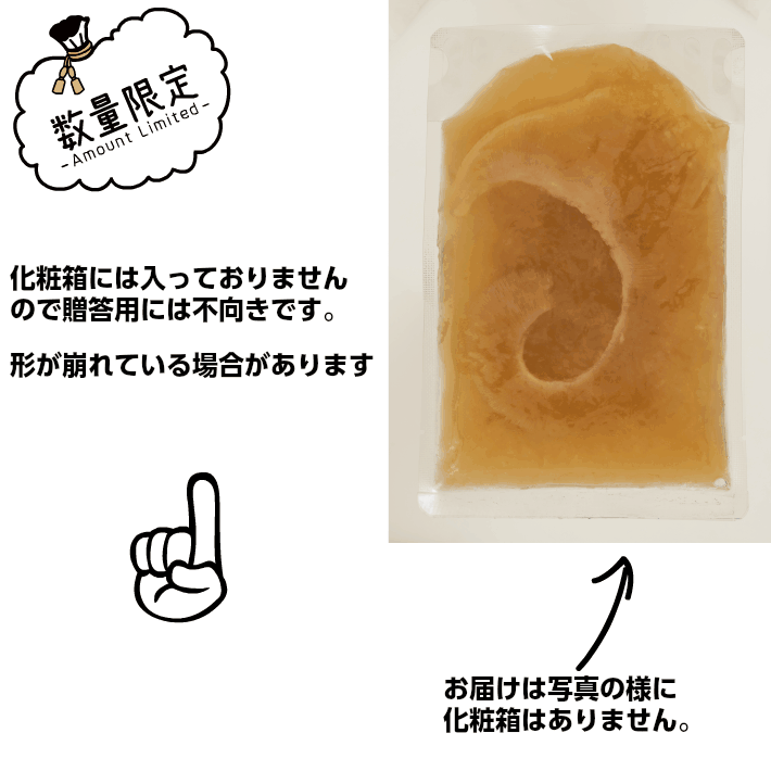 | ふかひれ姿煮は1人前のふかひれの煮込みです。 小型のひれは姿煮するのが難しいとされておりますが、試行錯誤重ね製品化致しました。 タレも吟味し、ふかひれの基本の味付けに石渡独自の味付けを合わせた、他には無い味に仕上がっております。そのままでも美味しくいただけますがラーメンにのせるだけで『姿煮ラーメン』、ご飯にのせて『フカヒレ丼』とバリエーションの広い料理素材としてもお使いいただけます。 | |
