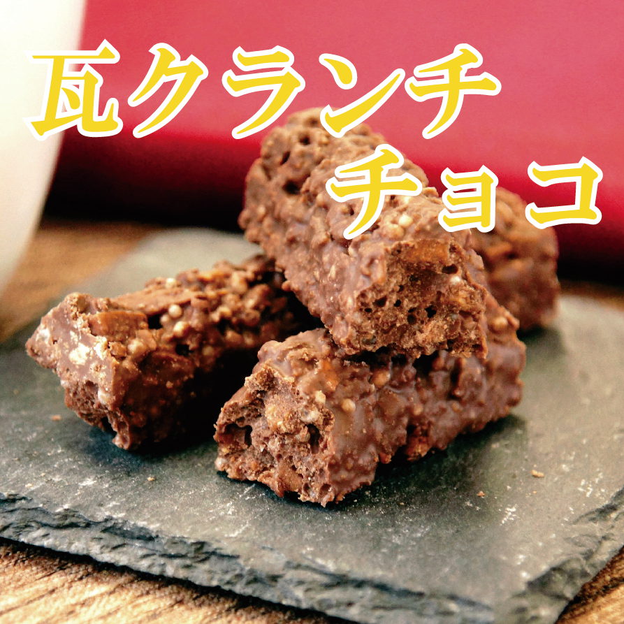 甘いミルクチョコレートと、讃岐名物”瓦せんべい”を 砕いて混ぜ合わせたチョコレート菓子。 瓦せんべいの堅焼きならではの魅力がチョコレートを チョコっとだけ特別にする瓦せんべいのあのザクザク食感が楽しい一品です。