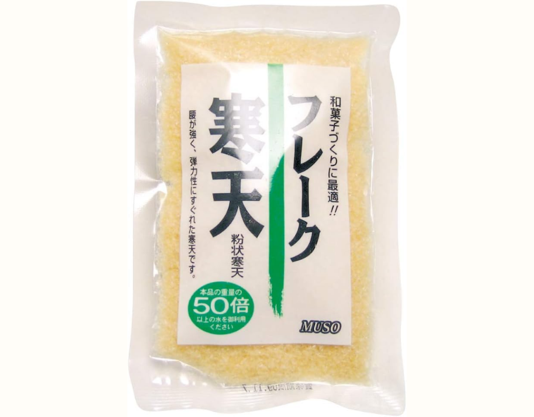 不純物の付着を避け、衛生的に作られた寒天です。フレーク状で、水洗いや溶かした後の裏ごしが不要なので手軽にご利用いただけます。