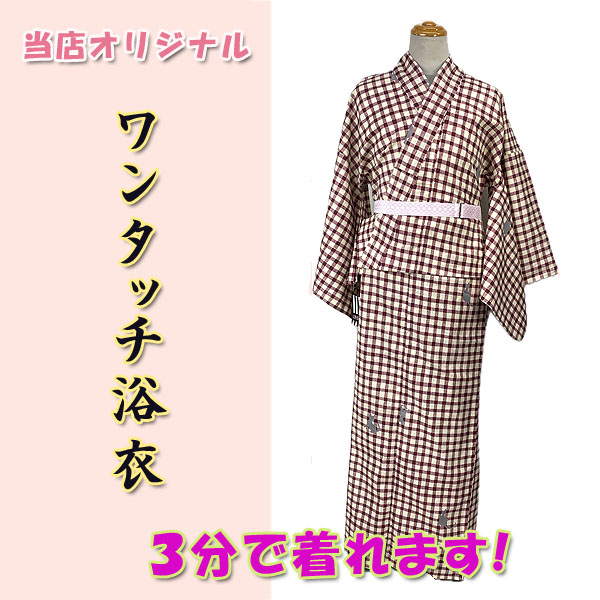 ワンタッチ浴衣 kjwy25-2 エンジチェック猫 女物夏ゆかた 巻くだけ簡単 3分で着れます