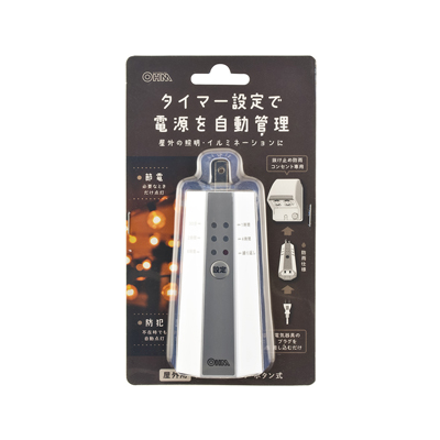 | 商品特徴 | ●タイマー設定で電源を自動管理 ●屋外の照明・イルミネーションを必要なときに点灯させ ●節電や防犯、イルミネーションの自動管理に ●ボタンを押すだけの、簡単タイマー設定 ●繰り返しモードにすると、24時間後に繰り返し稼働 ●2秒以上長押しで、常時通電 ●抜け止め防雨コンセント専用、IPX3(防雨型) |