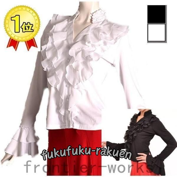 フラメンコ衣装 フリル トップス ブラウス 長袖 社交ダンス コーラス ステージ衣装 ダンス ラテン 舞台 衣装 コスチューム シースルー シャツ スタンドカラー 前ボタン レディース ジュニア 目立つ ヒップホップ ブラック ホワイト ミカドレス
