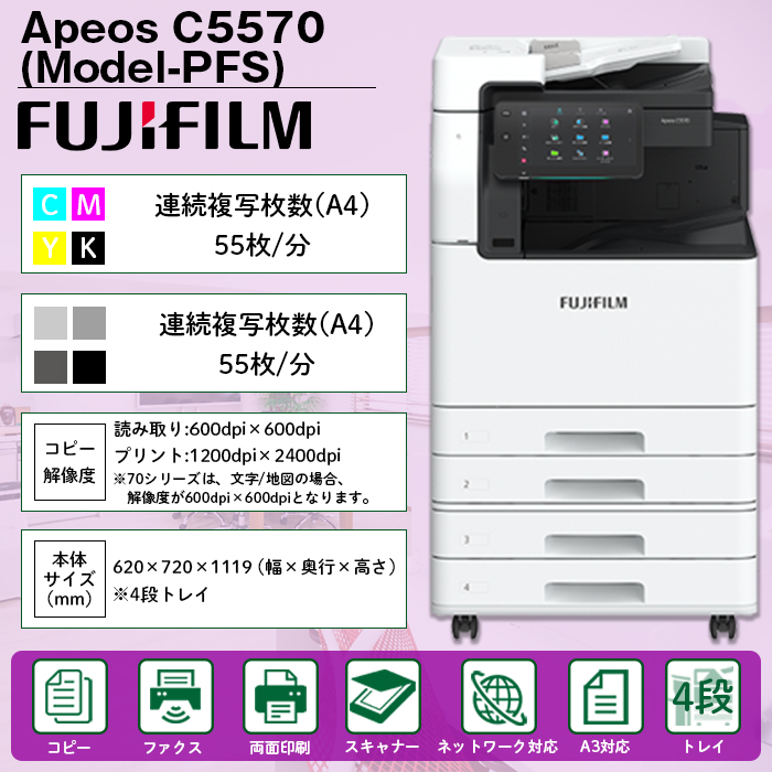 複合機 業務用 本体 FUJIFILM 富士フイルム Apeos C5570 4段 カラー55枚/分 モノクロ55枚/分 FAX プリンタ スキャナ A3 カラー
