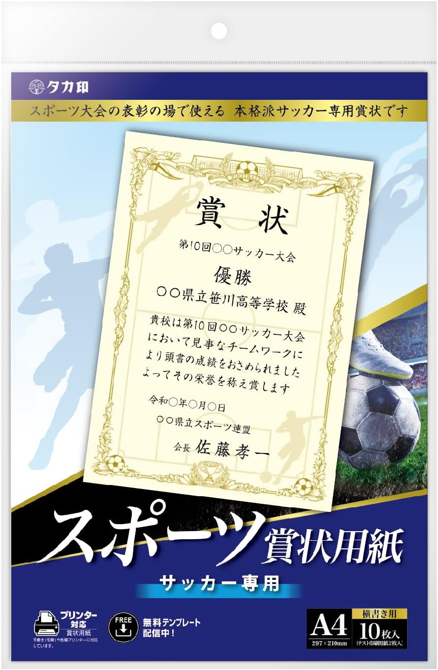 【全国送料無料】 郵便受けにお届け プリンター対応 スポーツ賞状用紙 A4判 サッカー 横書用 スポーツ サッカー 賞状 表彰状 オリジナル 作成 10枚入 10-1800
