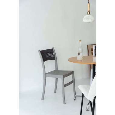 フレームの滑らかな曲線と、編み込み仕様の背もたれが特徴的なチェア。