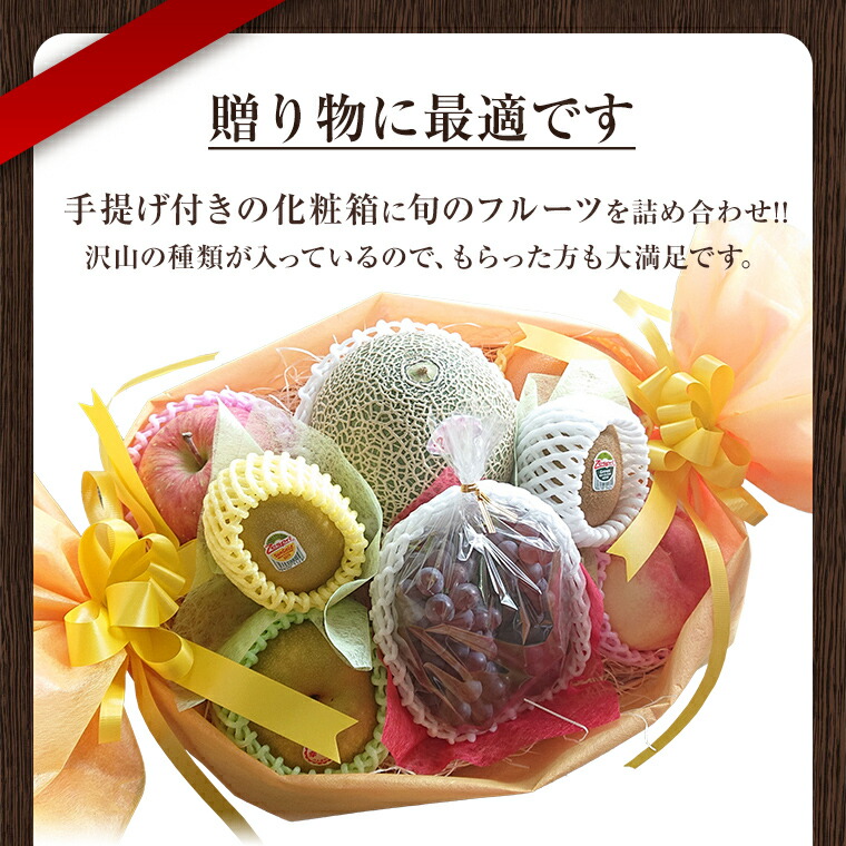 | 原産地 | メロン、林檎、柑橘、葡萄,、桃、キウイ、等 当社が厳選した旬の果物を詰め合わせいたします。 |
