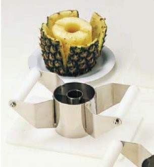 パインピラーPCシリーズは、業務用パイナップルカッターです。パイナップルの芯と外皮を同時にカットし果実を1/2の縦割りにします。サイズにM、L、LLの3種類ありますが、このページの商品はL(5ケ玉用)です。