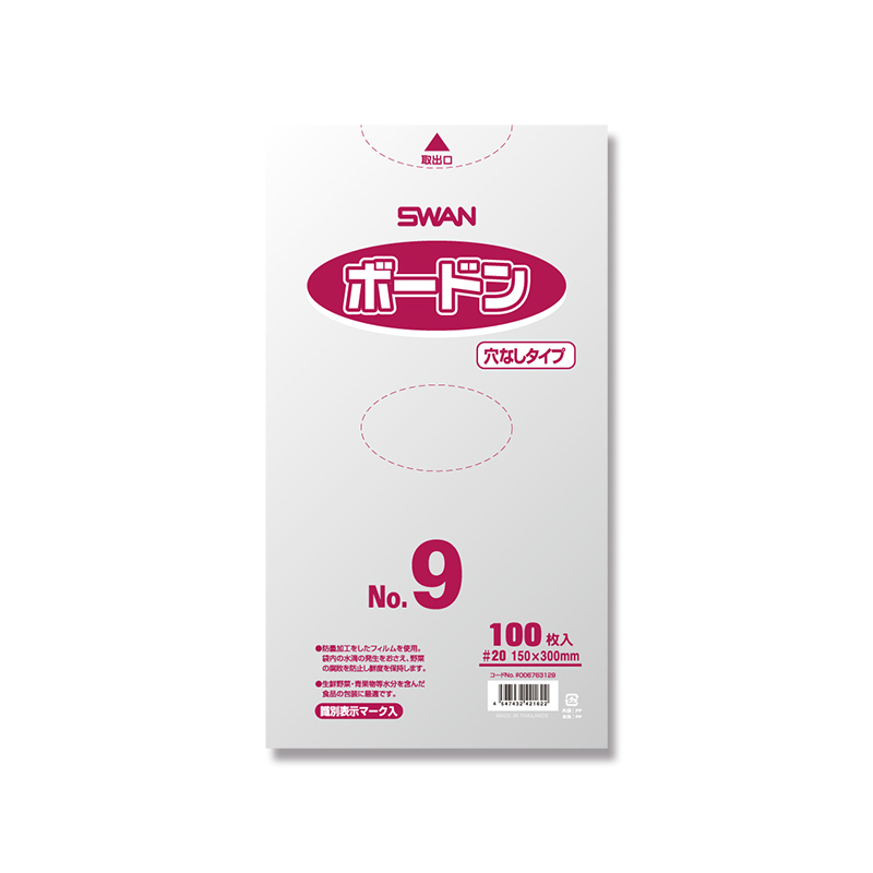 | 商品名 | SWAN ポリ袋 ボードンパック 穴なしタイプ 厚み0.02mm No.9(9号) | | メーカー | シモジマ | | ブランド名 | SWAN(スワン) | | サイズ | 150x300 | | 厚さ | 0.02mm | | 入数 | 100枚 | | カラー | 透明 | | 素材 | OPP | | 特長 | ・低価格なボードン袋です。曇りにくく、水滴がつきにくいので、農産物・青果物の包装に適しています。 ・生鮮野菜、果物を扱う青果店やスーパーなどの販売店、農家、市場におすすめ。シンプルな穴なしタイプです。 ・焼きたてを入れても曇りにくいのでパン袋としても使用できます。 ・食品衛生法規格基準適合商品です。 ・おすすめ農産物:にんじん/きゅうり/さつまいも/さといも | | 型番 | #006763129 | | 配送 | メール便不可。この商品は原則としてメーカー取寄後宅配便での配送になります。 | | 販売単位別 | 小袋単位 小ケース単位 ケース単位 | | 関連商品 | ボードンパック穴なし0.02mm厚 ボードンパック穴なし0.025mm厚 ボードンパック0.02mmコーナーカット ボードンパック柄入 ボードンパック穴あり0.02mm厚 ボードンパック穴あり0.025mm厚 食品用包装資材 | | 注意事項 | ・お客様ご都合によるご返品はお受けできかねます。あらかじめご了承下さい。