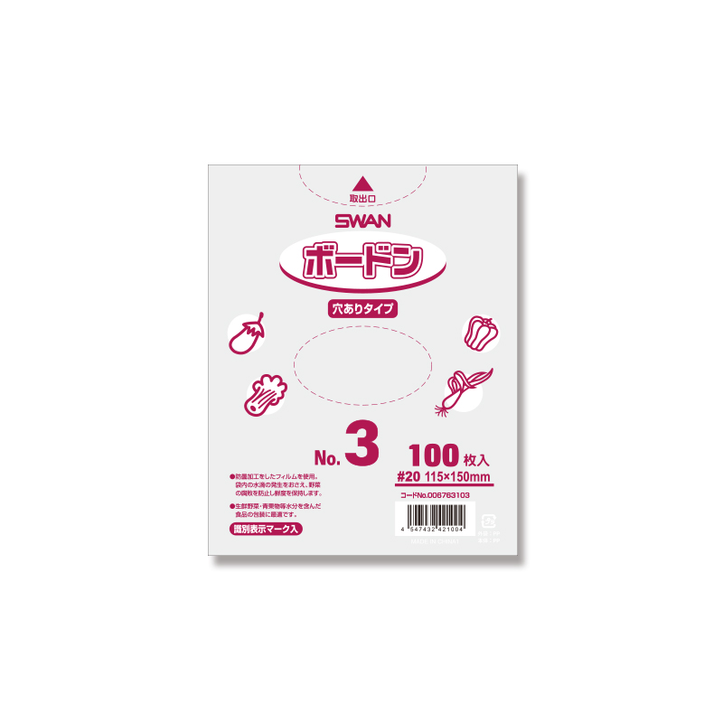 | 商品名 | SWAN ポリ袋 ボードンパック 穴ありタイプ(4穴) 厚み0.02mm No.3(3号) | | メーカー | シモジマ | | ブランド名 | SWAN(スワン) | | サイズ | 115x150 | | 厚さ | 0.02mm | | 入数 | 100枚 | | カラー | 透明 | | 素材 | OPP | | 特長 | ・低価格なボードン袋です。曇りにくく、水滴がつきにくいので、農産物・青果物の包装に適しています。 ・生鮮野菜、果物を扱う青果店やスーパーなどの販売店、農家、市場におすすめ。通気性を良くするため、空気穴があります。 ・食品衛生法規格基準適合商品です。 ・おすすめ農産物:大葉/インゲン/オクラ | | 型番 | #006763103 | | 配送 | メール便不可。この商品は原則としてメーカー取寄後宅配便での配送になります。 | | 販売単位別 | 小袋単位 小ケース単位 ケース単位 | | 関連商品 | ボードンパック穴なし0.02mm厚 ボードンパック穴なし0.025mm厚 ボードンパック0.02mmコーナーカット ボードンパック柄入 ボードンパック穴あり0.02mm厚 ボードンパック穴あり0.025mm厚 食品用包装資材 | | 注意事項 | ・お客様ご都合によるご返品はお受けできかねます。あらかじめご了承下さい。