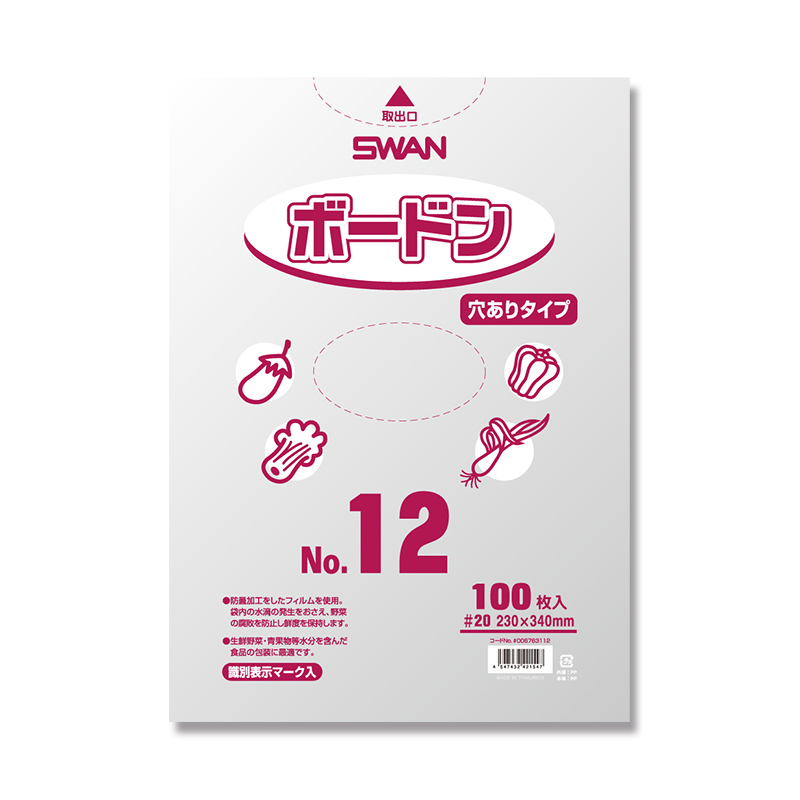 | 商品名 | SWAN ポリ袋 ボードンパック 穴ありタイプ(4穴) 厚み0.02mm No.12(12号) | | メーカー | シモジマ | | ブランド名 | SWAN(スワン) | | サイズ | 230x340 | | 厚さ | 0.02mm | | 入数 | 100枚 | | カラー | 透明 | | 素材 | OPP | | 特長 | ・低価格なボードン袋です。曇りにくく、水滴がつきにくいので、農産物・青果物の包装に適しています。 ・生鮮野菜、果物を扱う青果店やスーパーなどの販売店、農家、市場におすすめ。通気性を良くするため、空気穴があります。 ・食品衛生法規格基準適合商品です。 ・おすすめ農産物:ほうれん草/小松菜/チンゲン菜/ブロッコリー/ベビーリーフ/グレープフルーツ/バナナ | | 型番 | #006763112 | | 配送 | メール便不可。この商品は原則としてメーカー取寄後宅配便での配送になります。 | | 販売単位別 | 小袋単位 小ケース単位 ケース単位 | | 関連商品 | ボードンパック穴なし0.02mm厚 ボードンパック穴なし0.025mm厚 ボードンパック0.02mmコーナーカット ボードンパック柄入 ボードンパック穴あり0.02mm厚 ボードンパック穴あり0.025mm厚 食品用包装資材 | | 注意事項 | ・お客様ご都合によるご返品はお受けできかねます。あらかじめご了承下さい。