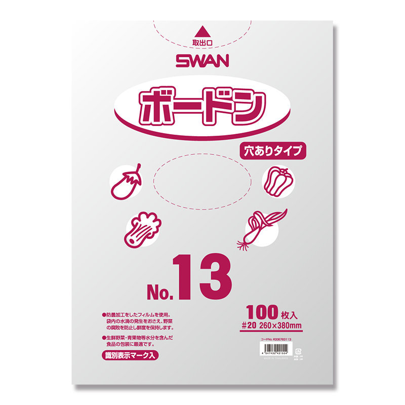 | 商品名 | SWAN ポリ袋 ボードンパック 穴ありタイプ(4穴) 厚み0.02mm No.13(13号) | | メーカー | シモジマ | | ブランド名 | SWAN(スワン) | | サイズ | 260x380 | | 厚さ | 0.02mm | | 入数 | 100枚 | | カラー | 透明 | | 素材 | OPP | | 特長 | ・低価格なボードン袋です。曇りにくく、水滴がつきにくいので、農産物・青果物の包装に適しています。 ・生鮮野菜、果物を扱う青果店やスーパーなどの販売店、農家、市場におすすめ。通気性を良くするため、空気穴があります。 ・食品衛生法規格基準適合商品です。 ・おすすめ農産物:ほうれん草/小松菜/チンゲン菜/ブロッコリー/レタス/白菜/グレープフルーツ/バナナ | | 型番 | #006763113 | | 配送 | メール便不可。この商品は原則としてメーカー取寄後宅配便での配送になります。 | | 販売単位別 | 小袋単位 小ケース単位 ケース単位 | | 関連商品 | ボードンパック穴なし0.02mm厚 ボードンパック穴なし0.025mm厚 ボードンパック0.02mmコーナーカット ボードンパック柄入 ボードンパック穴あり0.02mm厚 ボードンパック穴あり0.025mm厚 食品用包装資材 | | 注意事項 | ・お客様ご都合によるご返品はお受けできかねます。あらかじめご了承下さい。
