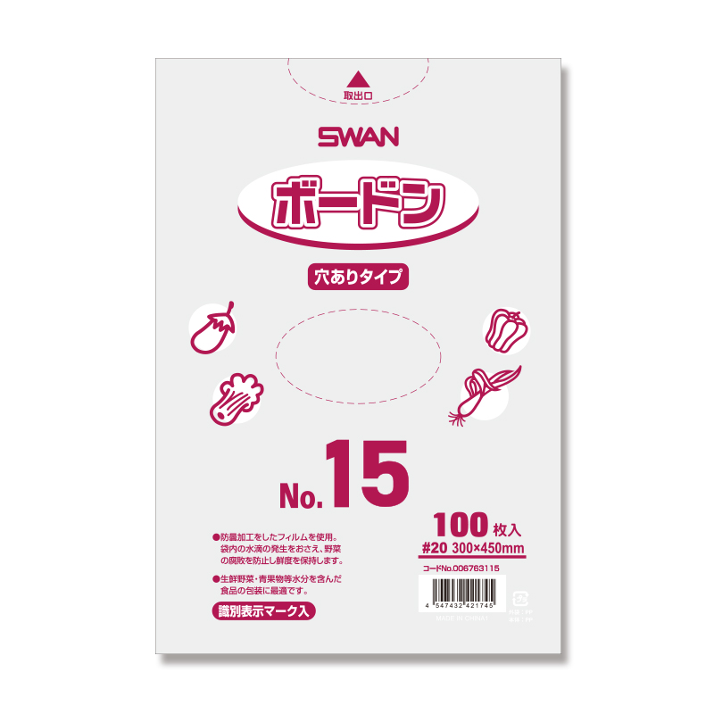 | 商品名 | SWAN ポリ袋 ボードンパック 穴ありタイプ(4穴) 厚み0.02mm No.15(15号) | | メーカー | シモジマ | | ブランド名 | SWAN(スワン) | | サイズ | 300x450 | | 厚さ | 0.02mm | | 入数 | 100枚 | | カラー | 透明 | | 素材 | OPPボードンフィルム | | 特長 | ・低価格なボードン袋です。曇りにくく、水滴がつきにくいので、農産物・青果物の包装に適しています。 ・生鮮野菜、果物を扱う青果店やスーパーなどの販売店、農家、市場におすすめ。通気性を良くするため、空気穴があります。 ・食品衛生法規格基準適合商品です。 ・おすすめ農産物:レタス/白菜 | | 型番 | #006763115 | | 配送 | メール便不可。この商品は原則としてメーカー取寄後宅配便での配送になります。 | | 販売単位別 | 小袋単位 小ケース単位 ケース単位 | | 関連商品 | ボードンパック穴なし0.02mm厚 ボードンパック穴なし0.025mm厚 ボードンパック0.02mmコーナーカット ボードンパック柄入 ボードンパック穴あり0.02mm厚 ボードンパック穴あり0.025mm厚 食品用包装資材 | | 注意事項 | ・お客様ご都合によるご返品はお受けできかねます。あらかじめご了承下さい。
