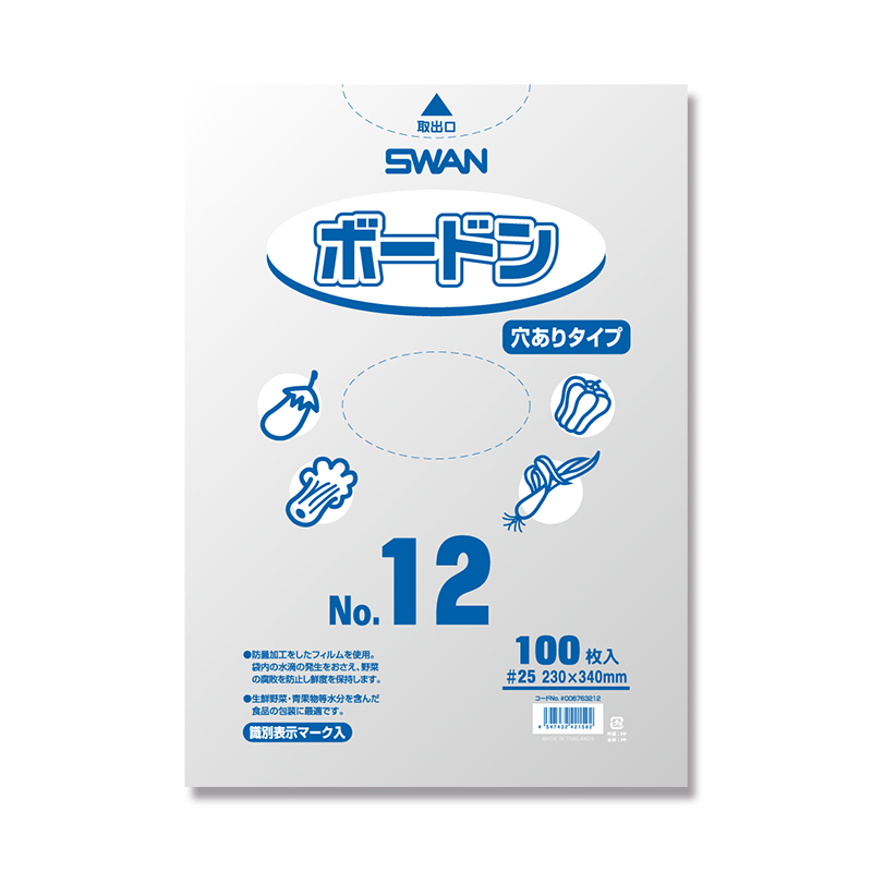 | 商品名 | SWAN ポリ袋 ボードンパック 穴ありタイプ(4穴) 厚み0.025mm No.12(12号) | | メーカー | シモジマ | | ブランド名 | SWAN(スワン) | | サイズ | 230x340 | | 厚さ | 0.025mm | | 入数 | 100枚 | | カラー | 透明 | | 素材 | OPP | | 特長 | ・低価格なボードン袋です。曇りにくく、水滴がつきにくいので、農産物・青果物の包装に適しています。 ・生鮮野菜、果物を扱う青果店やスーパーなどの販売店、農家、市場におすすめ。やや厚みがあるタイプで、通気性を良くするために空気穴があります。 ・食品衛生法規格基準適合商品です。 ・おすすめ農産物:ほうれん草/小松菜/チンゲン菜/ブロッコリー/ベビーリーフ/リンゴ/梨/グレープフルーツ/バナナ | | 型番 | #006763212 | | 配送 | メール便不可。この商品は原則としてメーカー取寄後宅配便での配送になります。 | | 販売単位別 | 小袋単位 小ケース単位 ケース単位 | | 関連商品 | ボードンパック穴なし0.02mm厚 ボードンパック穴なし0.025mm厚 ボードンパック0.02mmコーナーカット ボードンパック柄入 ボードンパック穴あり0.02mm厚 ボードンパック穴あり0.025mm厚 食品用包装資材 | | 注意事項 | ・お客様ご都合によるご返品はお受けできかねます。あらかじめご了承下さい。