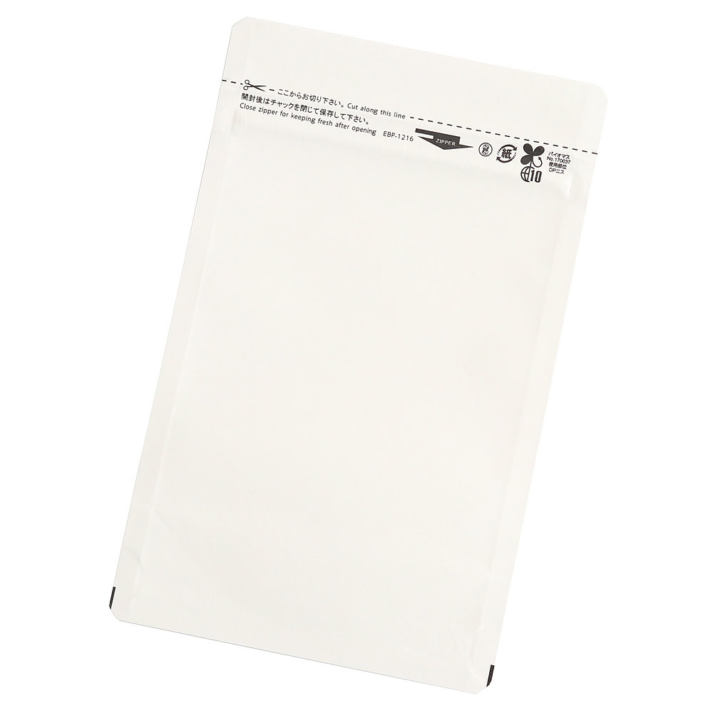 ラミジップエコバリアペーパー・スタンドパック純白紙タイプは食品・医療用途向け純白紙を採用しながら、高いバリア性を備えたチャック袋です。パウチの主原料が紙素材、OPニス、黒インキにバイオマスインキを使用。遮光性、防湿性に優れています。脱酸素剤使用可。アルミ蒸着PETのガスバリア性により封入物の酸化を防止。幅広い用途に対応します。