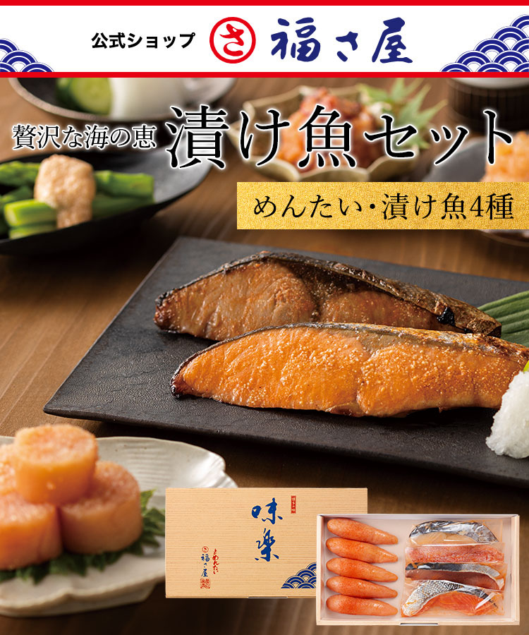 | 内容量 | 無着色辛子めんたい:180g 銀鮭めんたい味噌漬:(1切) ぶりめんたい味噌漬:(1切) 赤魚めんたい味噌漬:(1切) さわらめんたい味噌漬:(1切) |