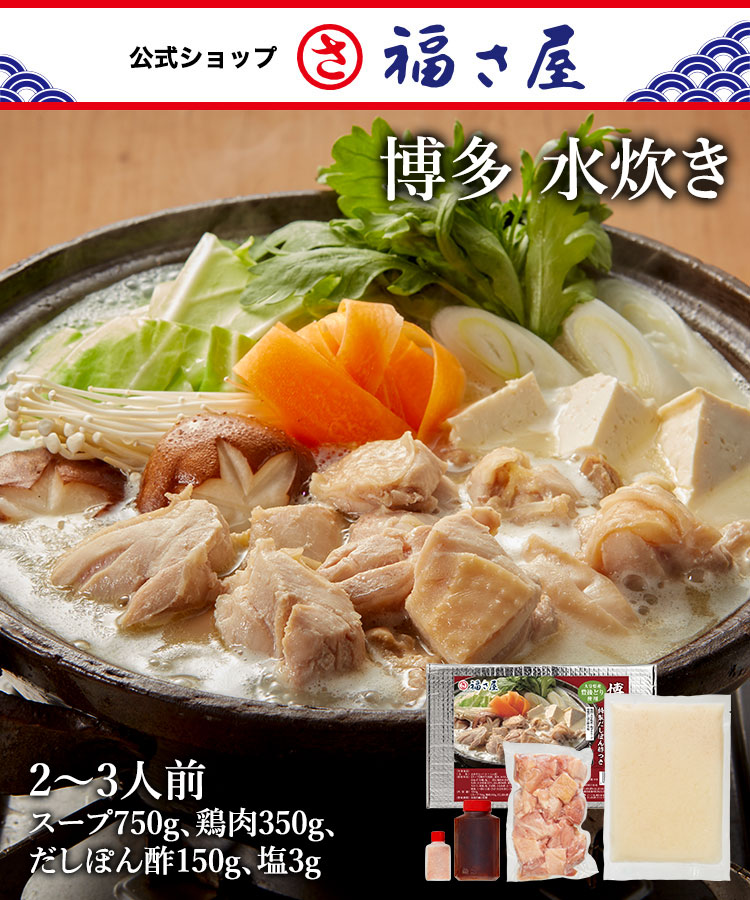 | 内容量 | 2〜3人前(スープ750g、鶏肉350g、だしぽん酢150g、塩3g) |