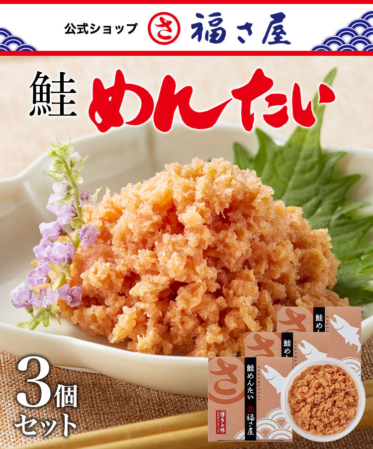 | 原材料 | すけとうだらの卵(ロシア又はアメリカ)、鮭フレーク(鮭、食用植物油脂、その他)(国内製造)、食塩、発酵調味料、澱粉、唐辛子、かつお節エキス、昆布エキス、魚醤、米酢、酵母エキス/調味料(有機酸等)、甘味料(ソルビット)、酸化防止剤(V.C)、増粘多糖類、着色料(黄5、赤102)、ナイアシン、発色剤(亜硝酸Na)、酵素、(一部に小麦・さけ・大豆を含む) |