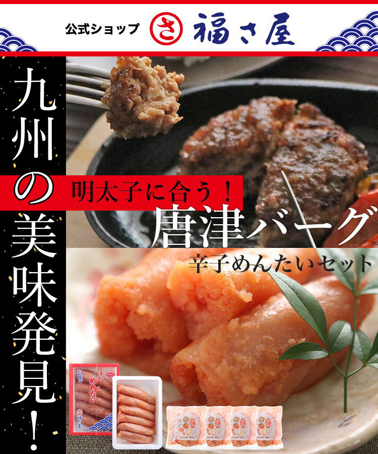 | 原材料名 | ・切子 家庭用無着色 辛子めんたい:すけとうだらの卵(ロシアまたはアメリカ) ・いきや食品 唐津バーグ:黒毛和牛(佐賀県産及び九州産)、豚肉(佐賀県産及び九州産)、玉ネギ、卵、パン粉、トマトケチャップ、塩、こしょう、ナツメグ、調味料(アミノ酸等)、(原材料の一部に小麦を含む) |