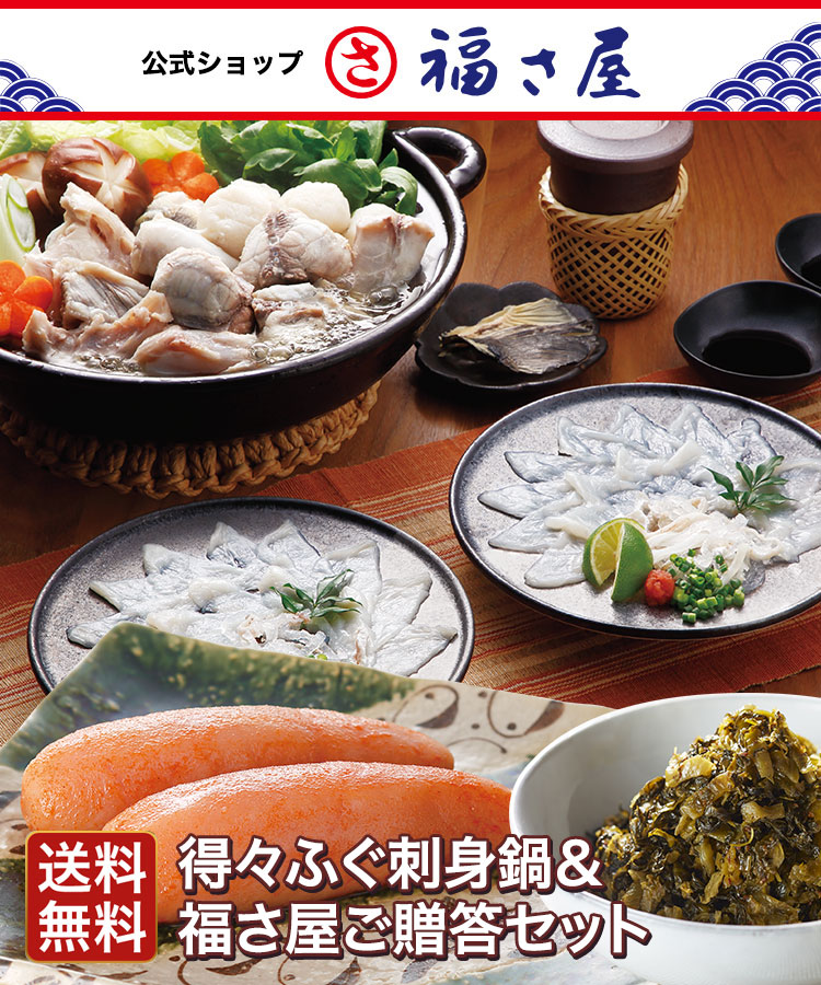 | 内容量 | 得々ふぐ刺身鍋セット(2人前):鍋用アラ200g、鍋用切身200g、ふぐ皮ツミレ4個、刺身20g×2、皮湯引12g×2、ふぐヒレ3枚、ポン酢、紅葉おろし 無着色辛子めんたい:270g めんたい辛子たかな:250g |