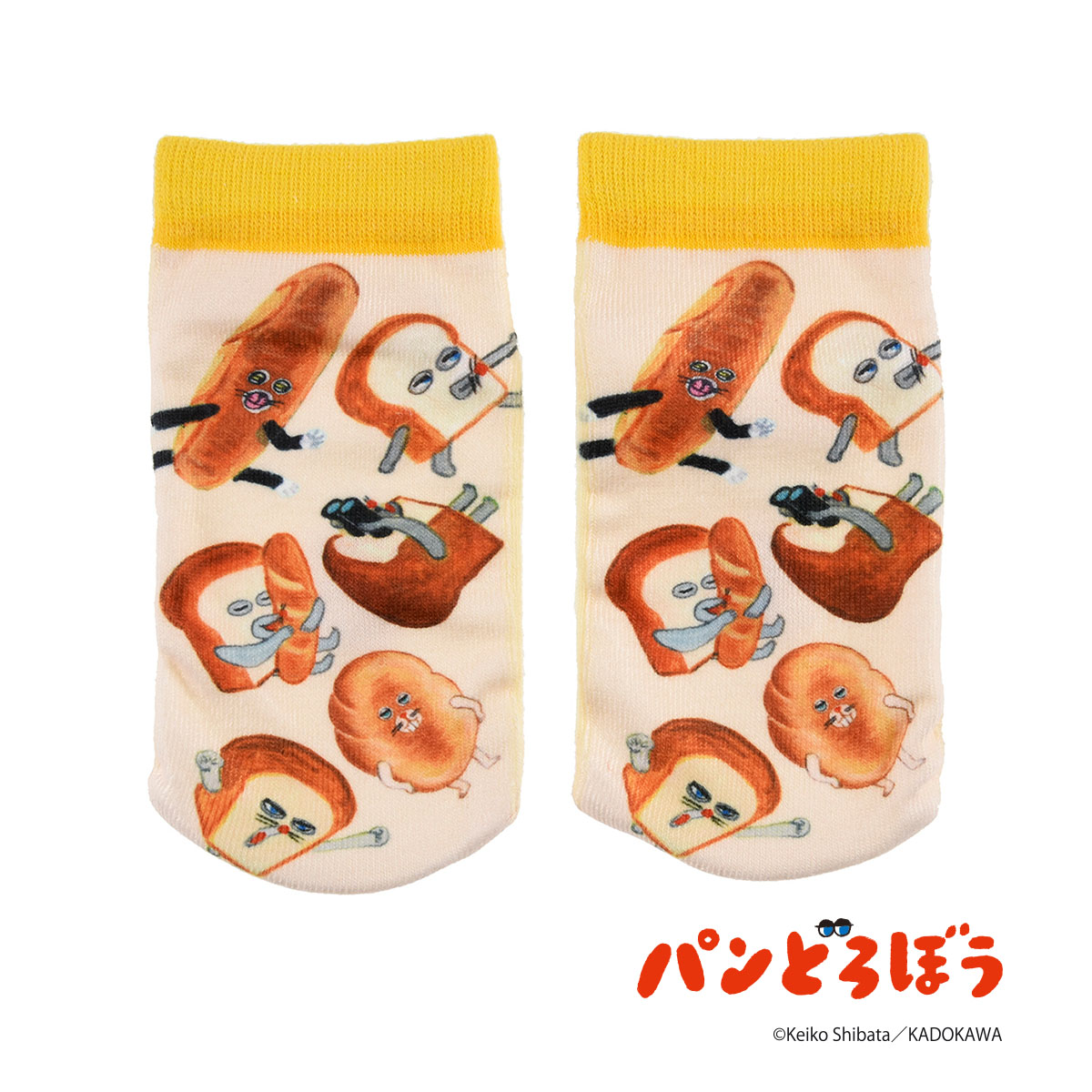 大人気「パンどろぼう」からスニーカー丈ソックスの登場です。パンどろぼう総柄がおもしろかわいいデザインの一足です。便利なお名前スペース付きです。