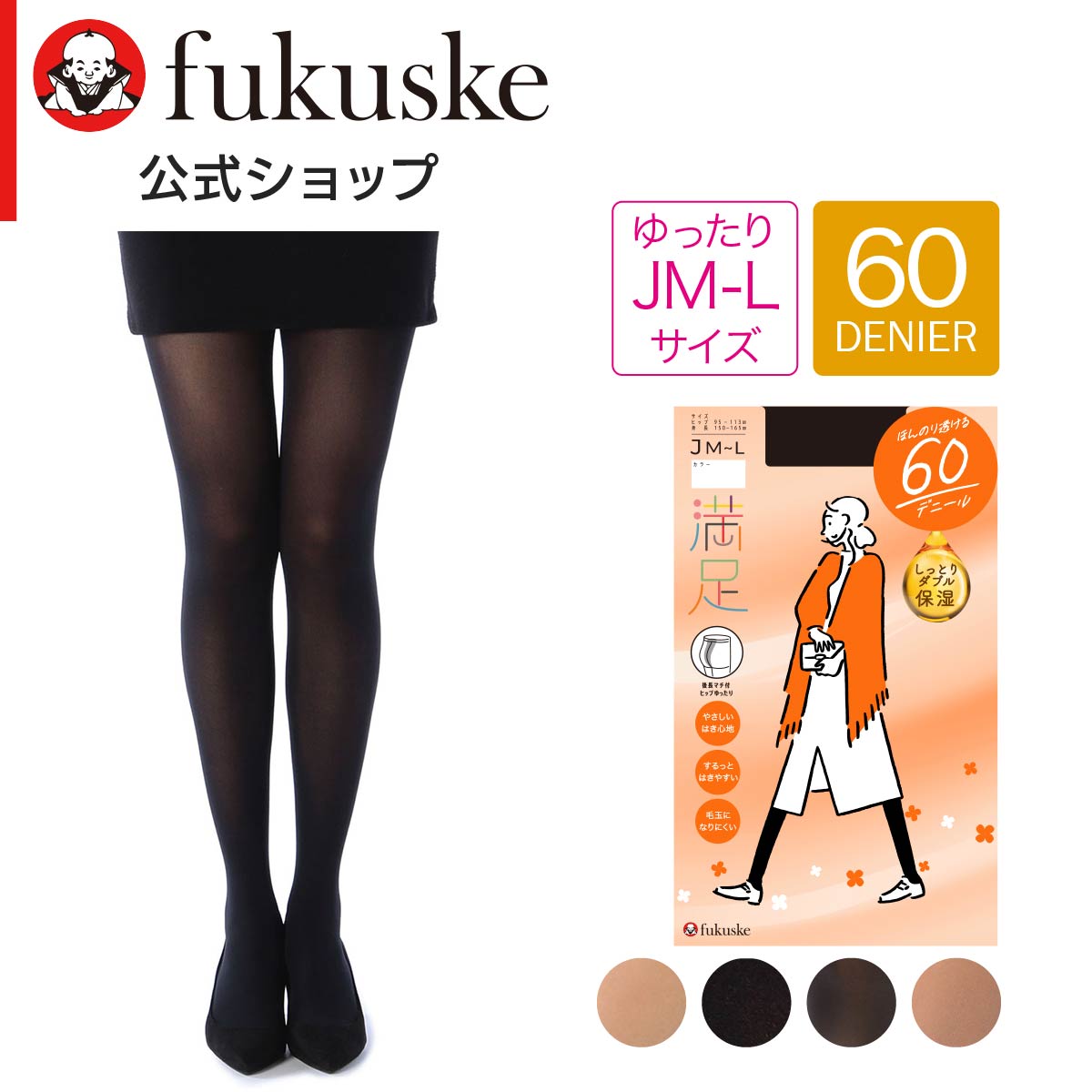 ナチュラルにほんのり透ける60デニールのお尻がゆったりとしたJM-Lサイズのタイツです。毛玉ができにくく(抗ピル加工)、暖かい発熱加工を施し、寒い季節におすすめ。幅広のソフトウエスト設計でウエストがやわらかく、パンティ部の後長マチを付けることでお腹もお尻もゆったりと過ごせます。消臭ポリウレタンを採用し、冬場のシューズやブーツ時の気になるニオイに対してもサポートをしてくれます。また、乾燥しやすい季節にうれしい静電気防止加工やしっとりうるおうプロテオグリカン・スクワランを配合した福助オリジナルのダブル保湿加工も施しており、するっとはけて、なめらかなタッチのはき心地にこだわった福助の定番タイツです。