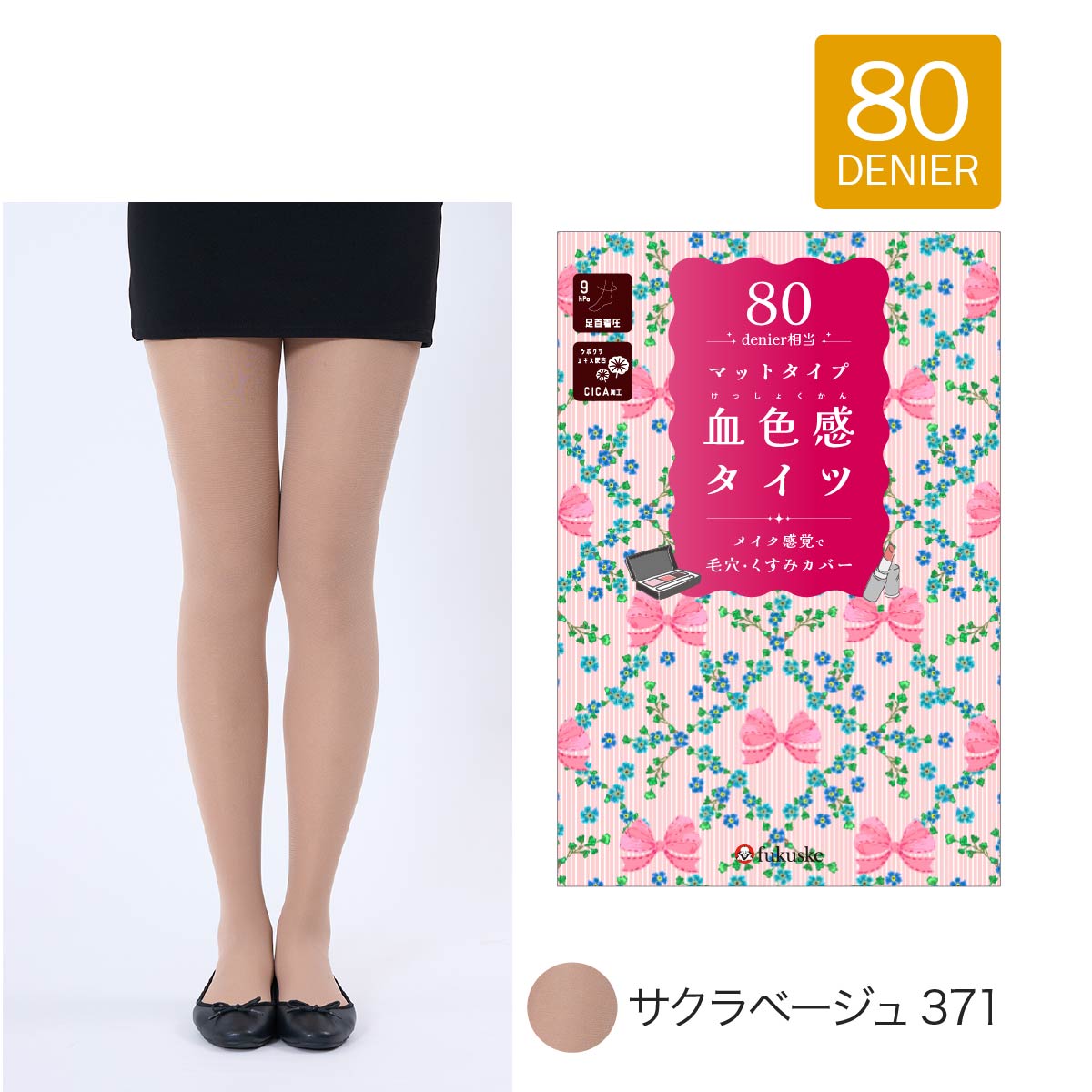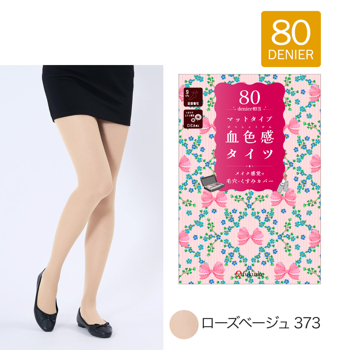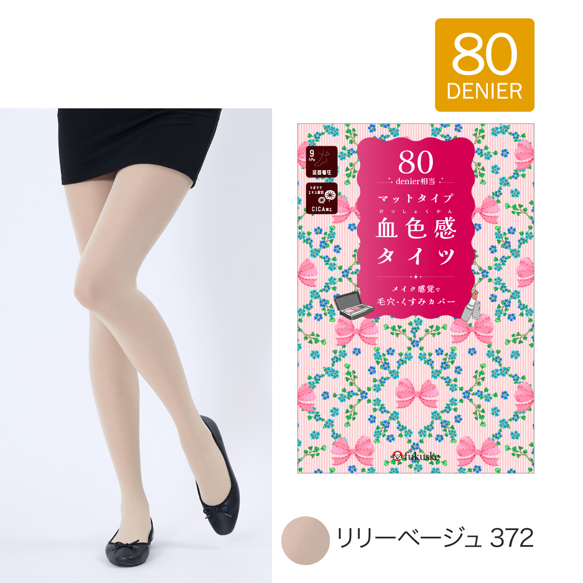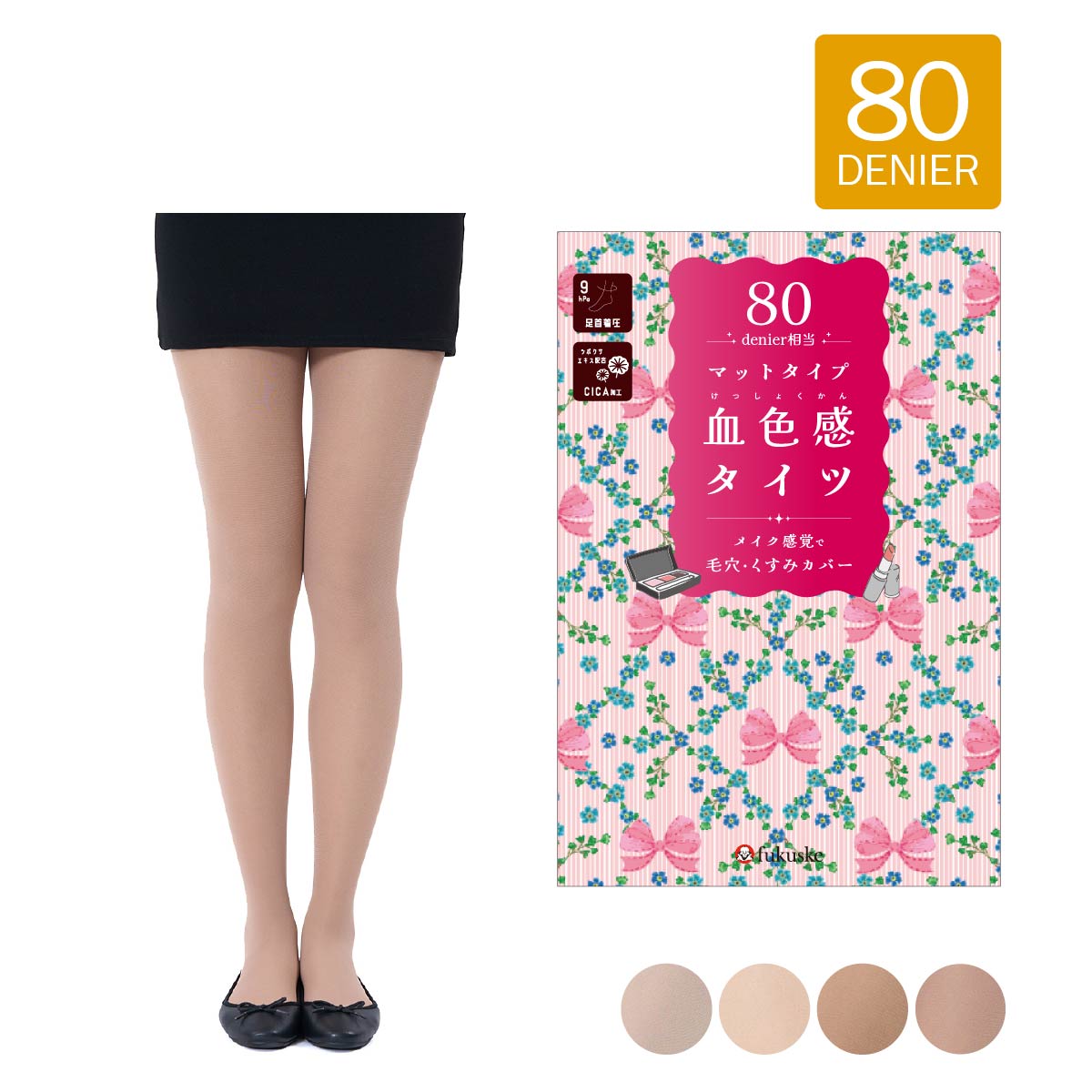 暖かさと素肌感の両方を実現できるベージュカラーのタイツの登場です。80デニールなので暖かく、しっかりと傷や毛穴など肌の悩みをカバーしてくれます。お肌に合わせた絶妙なカラー展開、防寒対策をしながら寒い時期もおしゃれを楽しめます。さらに着圧設計、CICA加工で保湿効果、つま先スルーと多機能です。