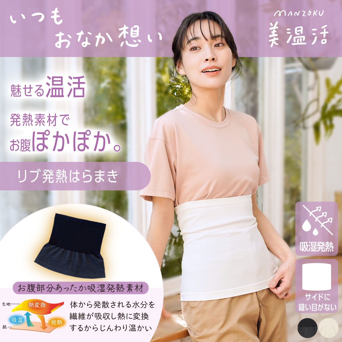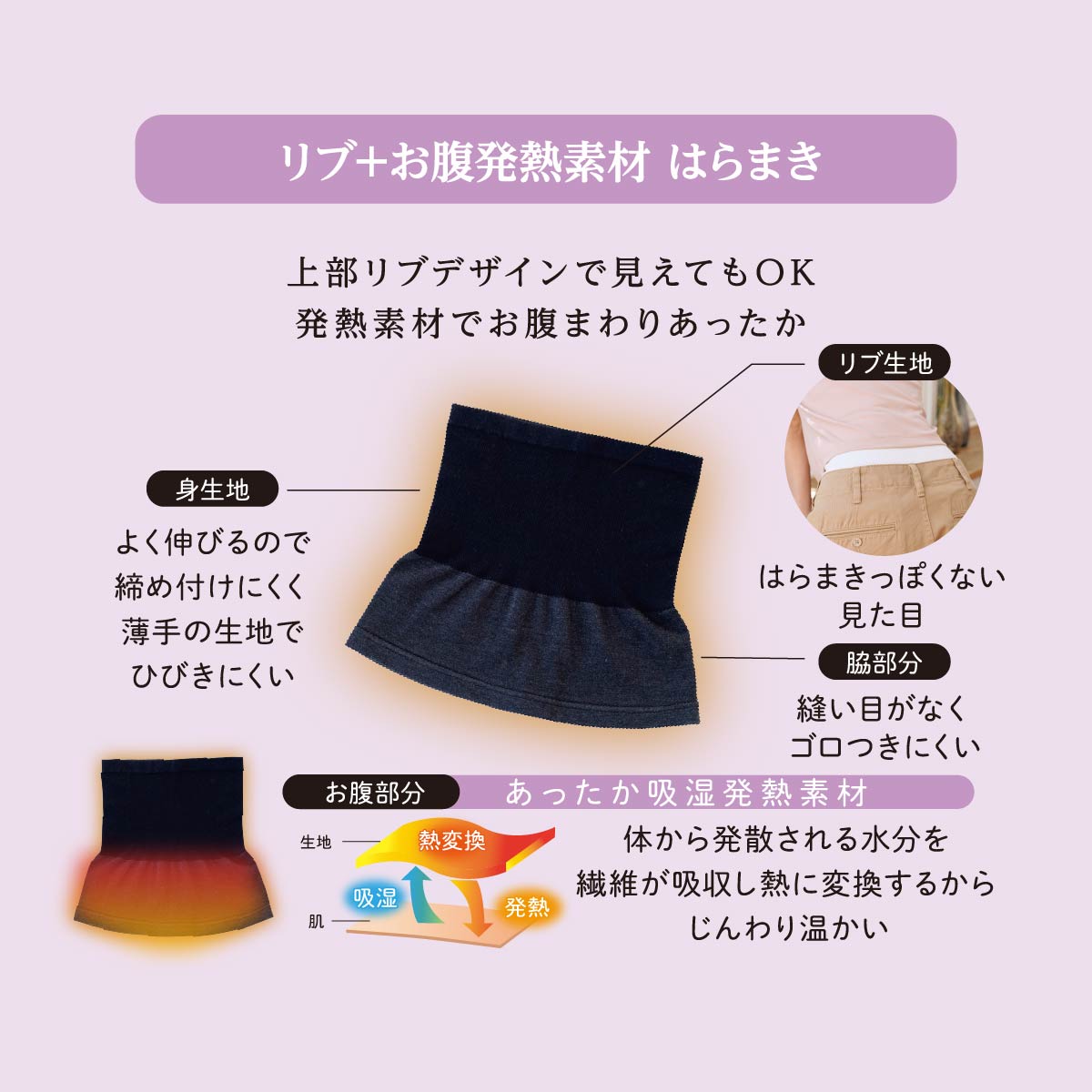 美温活「はらまき心地」シリーズのリブ発熱はらまきです。お腹部分は吸湿発熱素材を使用し、体から放出された水蒸気を吸収してすっきり心地良い暖かさを感じることができます。上部は見えてもOKのリブデザインです。