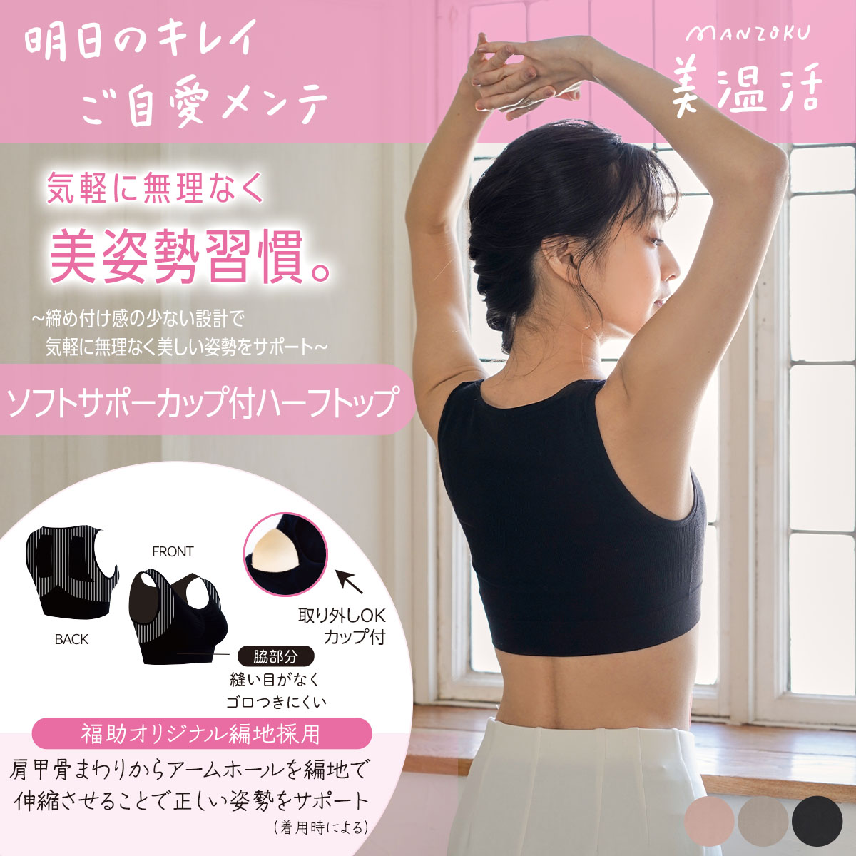 満足:美温活 美姿勢 カップ付きハーフトップ 動きやすいストレッチ性の良い編み地 肩甲骨まわりの福助オリジナル編地で正しい姿勢をサポート