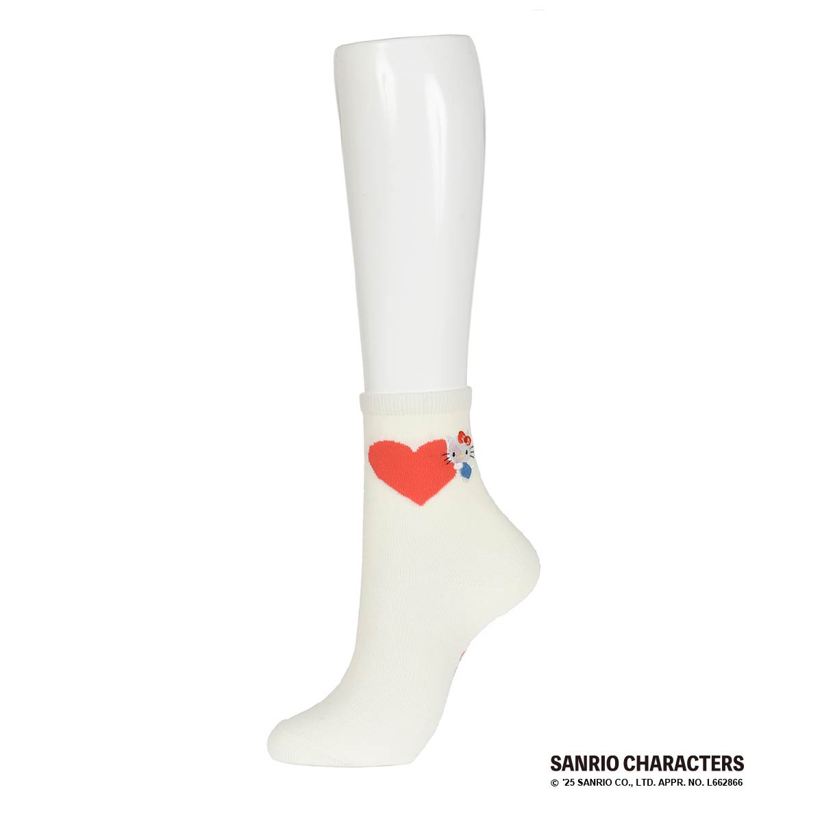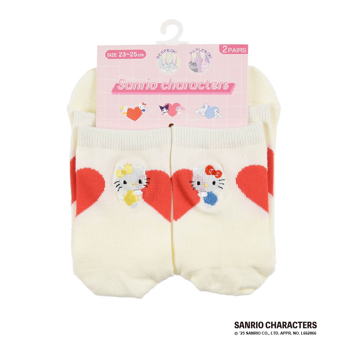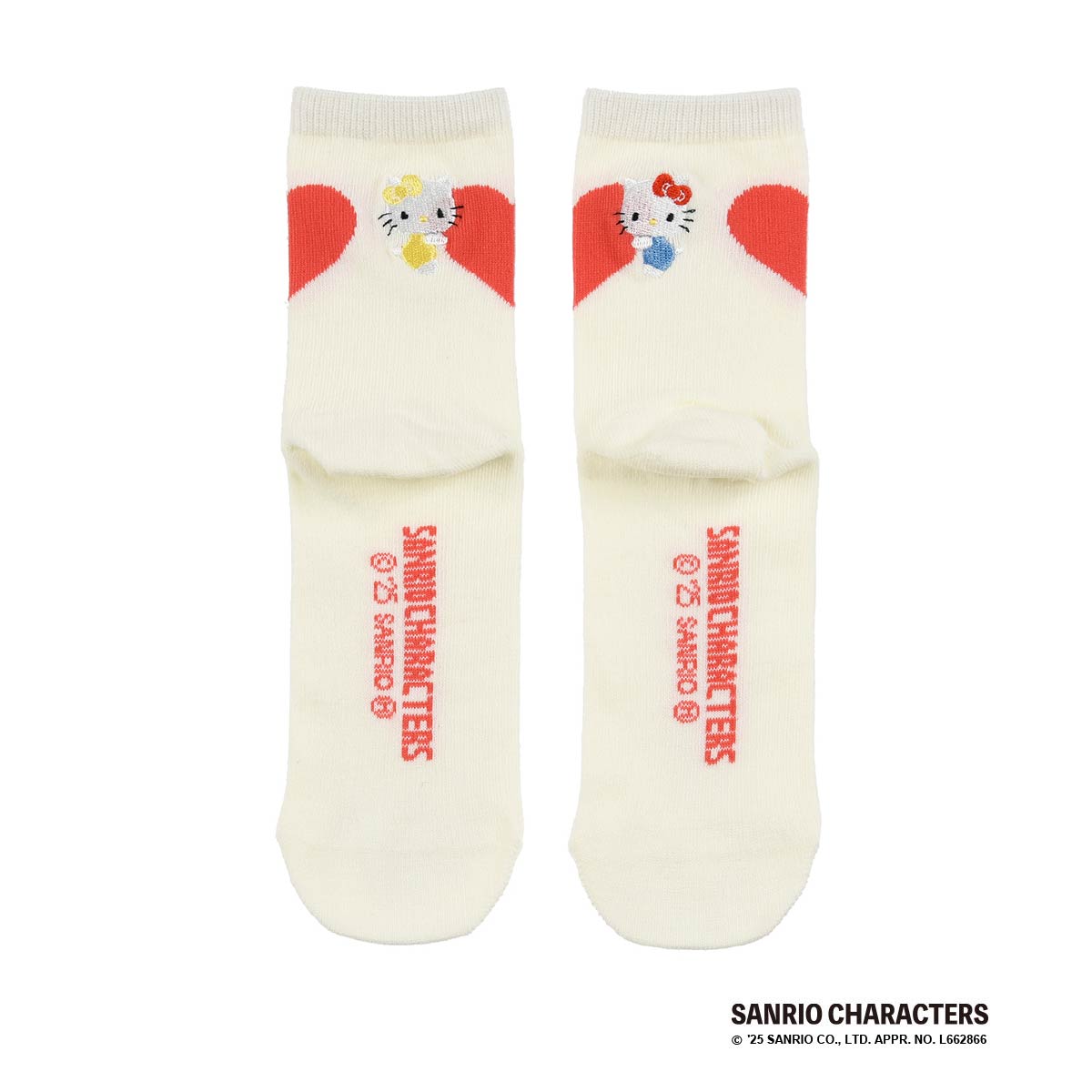 サンリオの人気キャラクター、キティちゃんのクルー丈ソックスです。片足ごとにハートを持ったキティちゃんとミミィちゃんが刺しゅうされています。両足を揃えるとひとつのハートになるバックデザインもポイントです。一人で両方履いてもシェアしてそろえても可愛い2足組です。