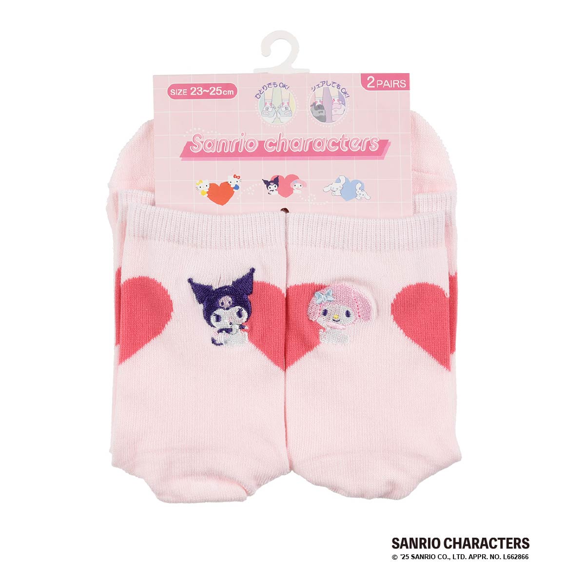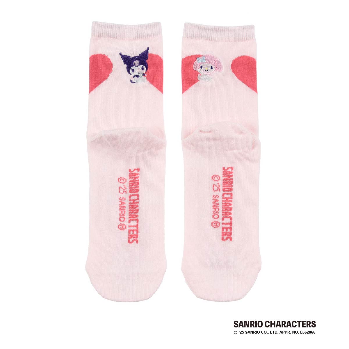 サンリオの人気キャラクター、クロミとマイメロディのクルー丈ソックス2足組です。片足ごとにハートを持ったクロミとマイメロディが刺しゅうされています。両足を揃えるとひとつのハートになるバックデザインもポイントです。一人で両方履いてもシェアしてそろえても可愛い2足組です。