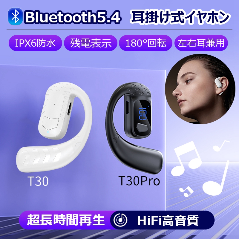 【左右耳兼用】ワイヤレスイヤホン 片耳 bluetooth5.4 180度回転 耳掛け式 IPX6防水 Hi-Fi高音質 ブルートゥースイヤホン type-C充電 耳を塞がない LED電力表示
