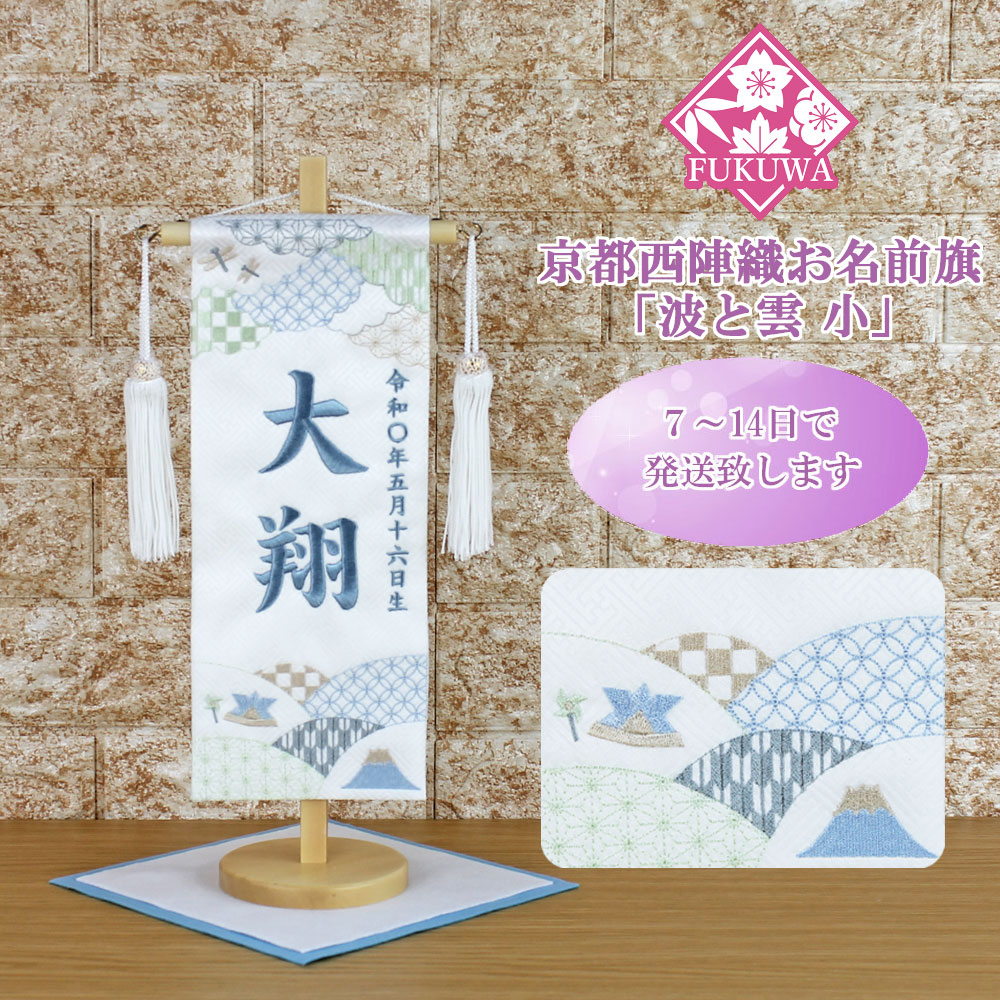 五月人形 名前旗 総刺繍 端午の節句 名前入旗(波と雲 小 白 H-1533-20F 房付き)京都西陣織使用 木製スタンド付 男の子 5月人形