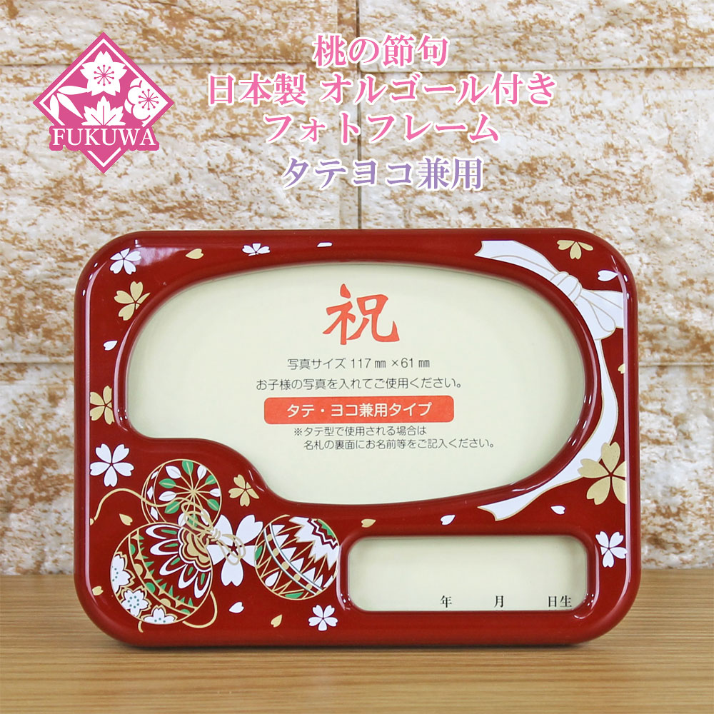 雛人形 お名前木札 コンパクト オルゴール付き 写真立て 【日本製 フォトフレーム タテヨコ兼用型 小(桜に毬/赤)】