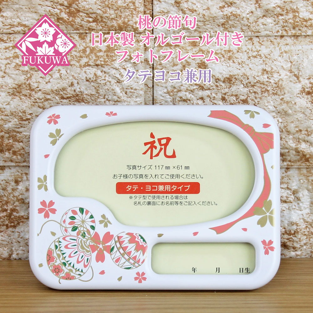 雛人形 お名前木札 コンパクト オルゴール付き 写真立て 【日本製 フォトフレーム タテヨコ兼用型 小(桜に毬/マットホワイト)】