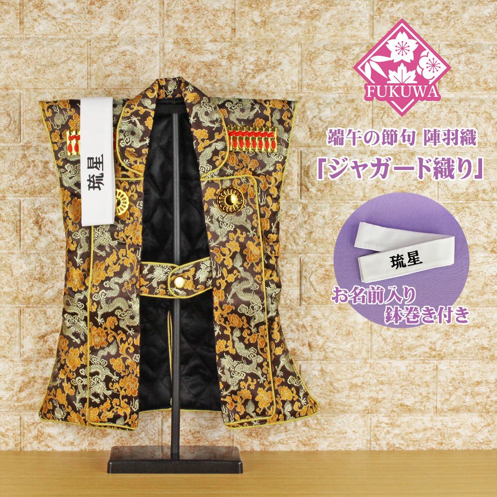 初節句 陣羽織 端午の節句 お名前はち巻き付き(ジャガード 龍 茶)スタンド付き 名入れ 5月人形 子供用 男の子 五月人形