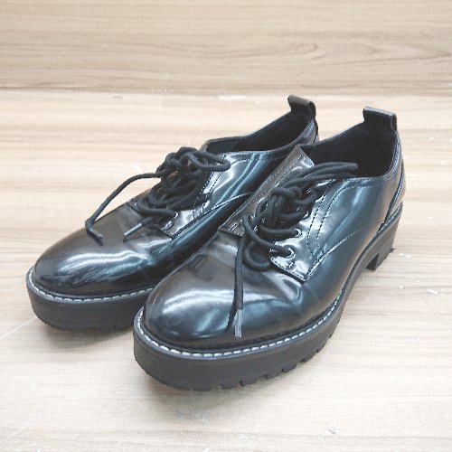 ◇ ZARA ザラ レースアップ カジュアル ヒール シンプル デッキシューズ サイズ38 ブラック レディース E