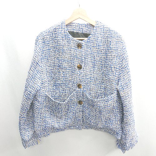 ◇ ⊇ ノーブランド ツイード 総柄 長袖 ノーカラージャケット サイズ表記なし ブルー系 レディース E
