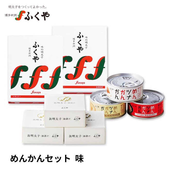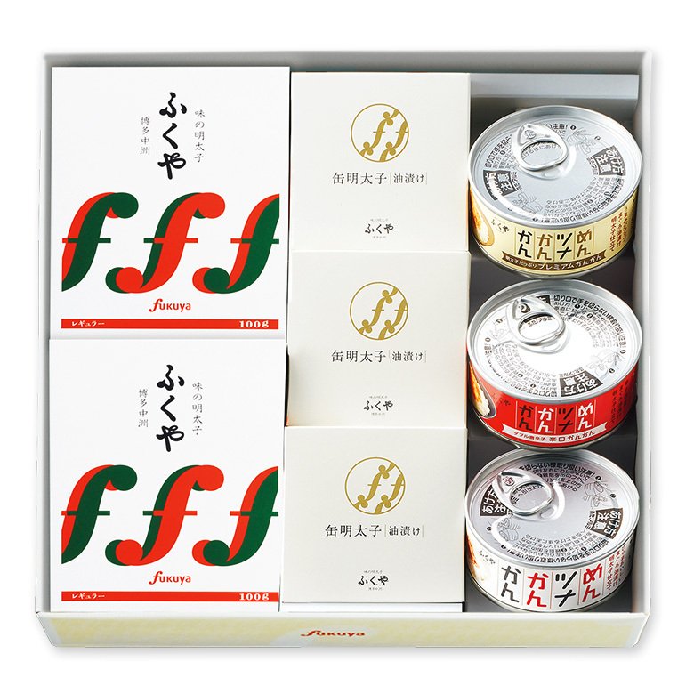 | 内容量 | ・味の明太子:100g×2 ・缶明太子 油漬け:85g×3 ・めんツナかんかん・めんツナかんかん<辛口>・めんツナかんかん<プレミアム>:各90g×1缶 |