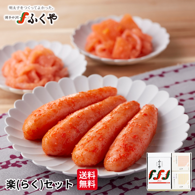 楽セットは、味の明太子200gとあえもの明太子の「いか明太子」と「あえもの三昧明太子」を詰め合わせてオリジナルギフト箱に入れた商品です。