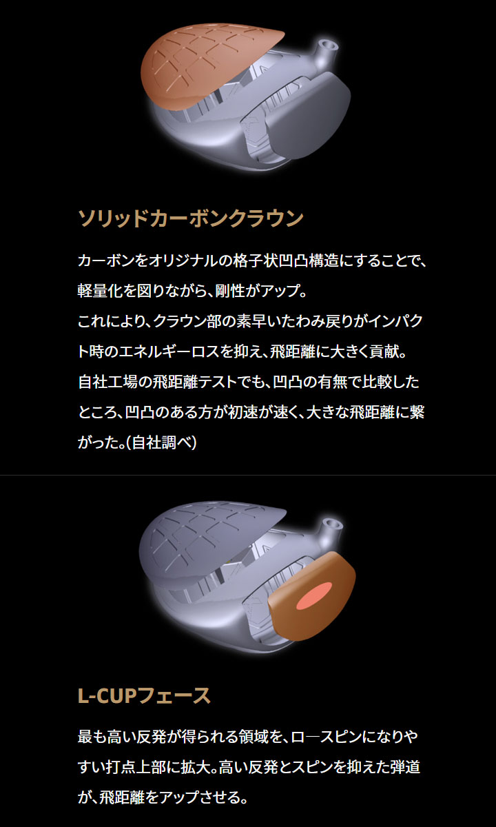 BERESの歴史上、最速のボールスピードを実現した、NX 。 その秘密は、格子状のデザインが印象的なソリッドカーボンクラウンに隠されています。 ソリッドカーボンクラウンは、 HONMAが独自に開発したオリジナルの構造で、軽量化と剛性アップを同時に実現。 脅威のスピードと飛距離を手にすることに成功しました。