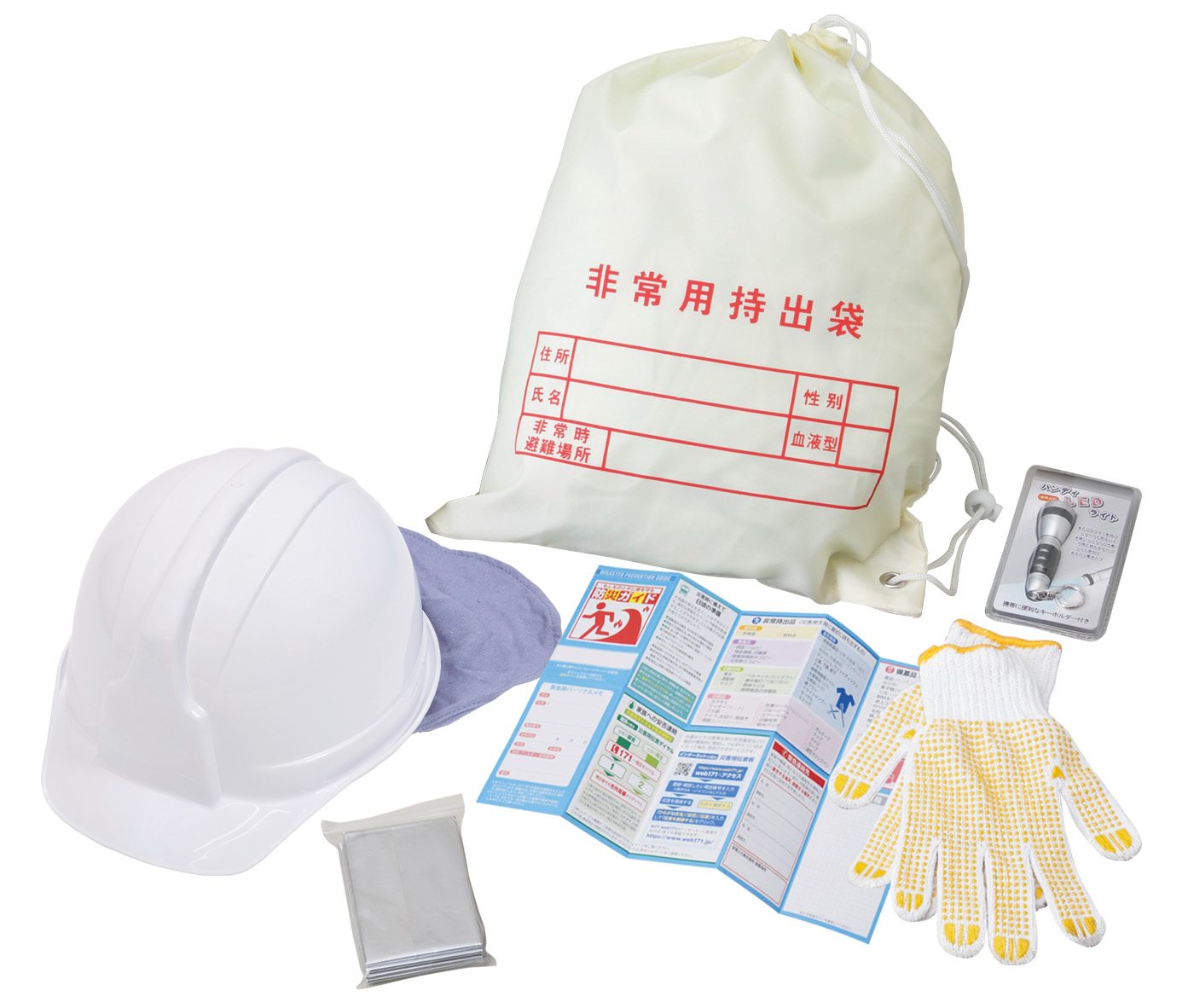 内容: ・防災用ヘルメット(たれ覆い付き)・チェックリスト付非常袋・LEDミニライト(ボタン電池LR41×4個入)・防寒シート・すべり止め手袋・防災ガイド