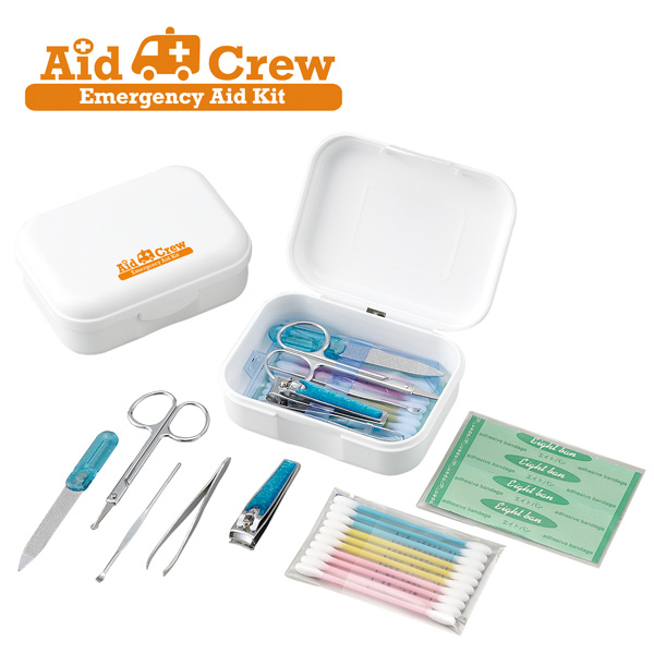 内容; 専用ケース、キズテープM(3枚入)、グルーミング5点セット(爪切り、エチケットハサミ、耳かき、爪ヤスリ、毛抜き兼ピンセット)[中国産]、カラー綿棒(10本入)[タイ産]