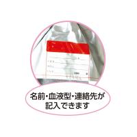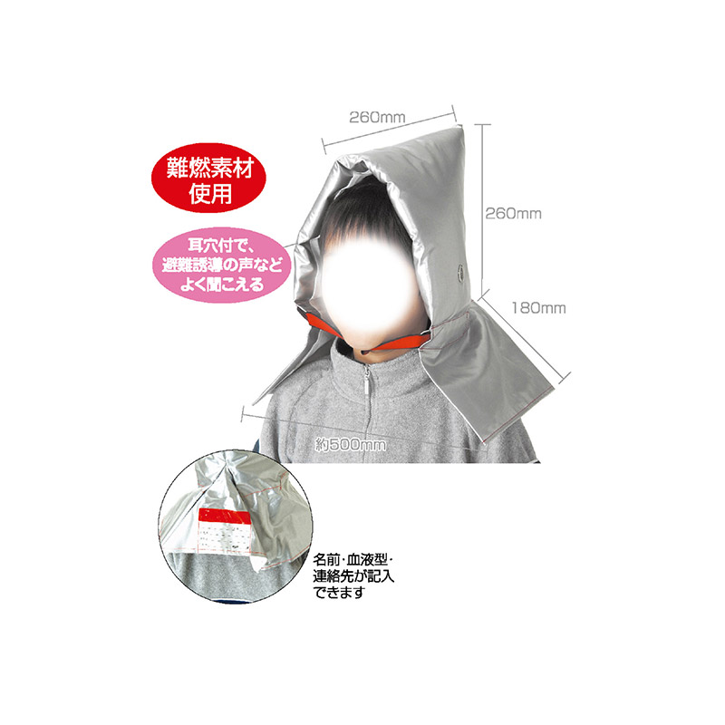 避難時の危険から身を守る!特長(1)耐熱・耐火アルミ素材使用。特長(2)耳穴付で避難誘導の声などが聞こえるように配慮。特長(3)肩までしっかりおおえます。特長(4)扱いやすく、しっかり止まるフック付。特長(5)夜間の安全を考慮し、反射テープを付けています。特長(6)名前の他、血液型・連絡先も記入できます。