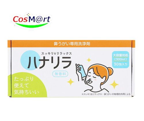 | 【用法・用量/使用方法】 | <使用方法> 1.ハナリラの容器(別売)に洗浄剤を1包入れます。 2.300mLの線までぬるま湯(目安は37〜40度)を注ぎます。 3.容器をよく振り、洗浄剤がすべて溶け切ったことを確認してから使用してください。 |