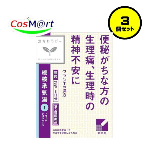 | 【成分・分量】 | 成人1日の服用量3包(1包1.2g)中、次の成分を含んでいます。 桃核承気湯エキス粉末・・・・・・・・・・・・・1,250mg (トウニン2.5g、ケイヒ2.0g、ダイオウ1.5g、カンゾウ0.75g、無水ボウショウ0.5gより抽出。) 添加物として、ヒドロキシプロピルセルロース、乳糖、ポリオキシエチレンポリオキシプロピレングリコールを含有する。 |