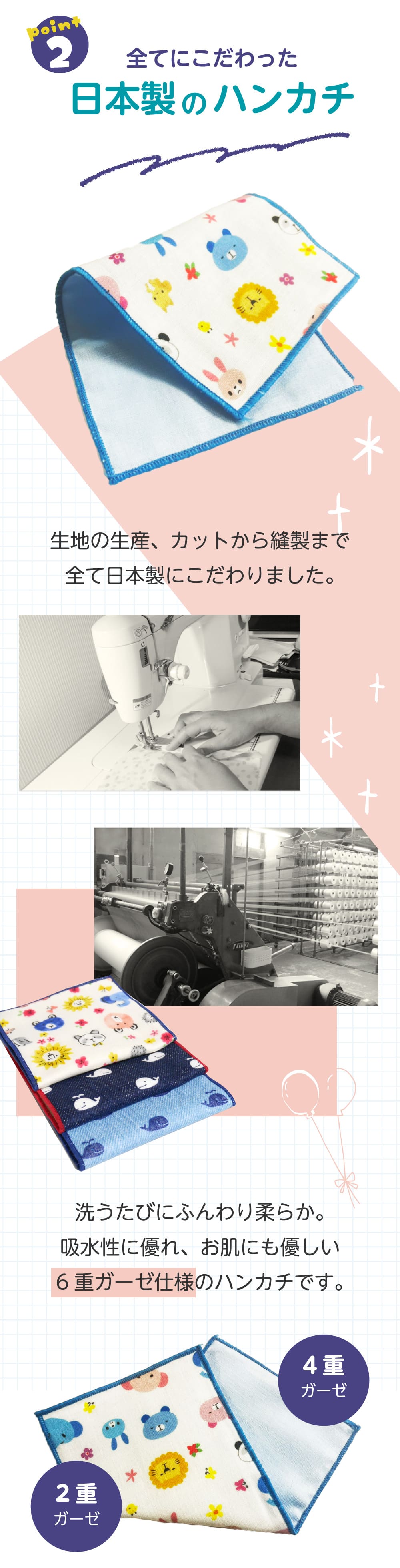 綿100%!4重ガーゼと2重ガーゼを合わせた6重ガーゼを使用したハーフハンカチ