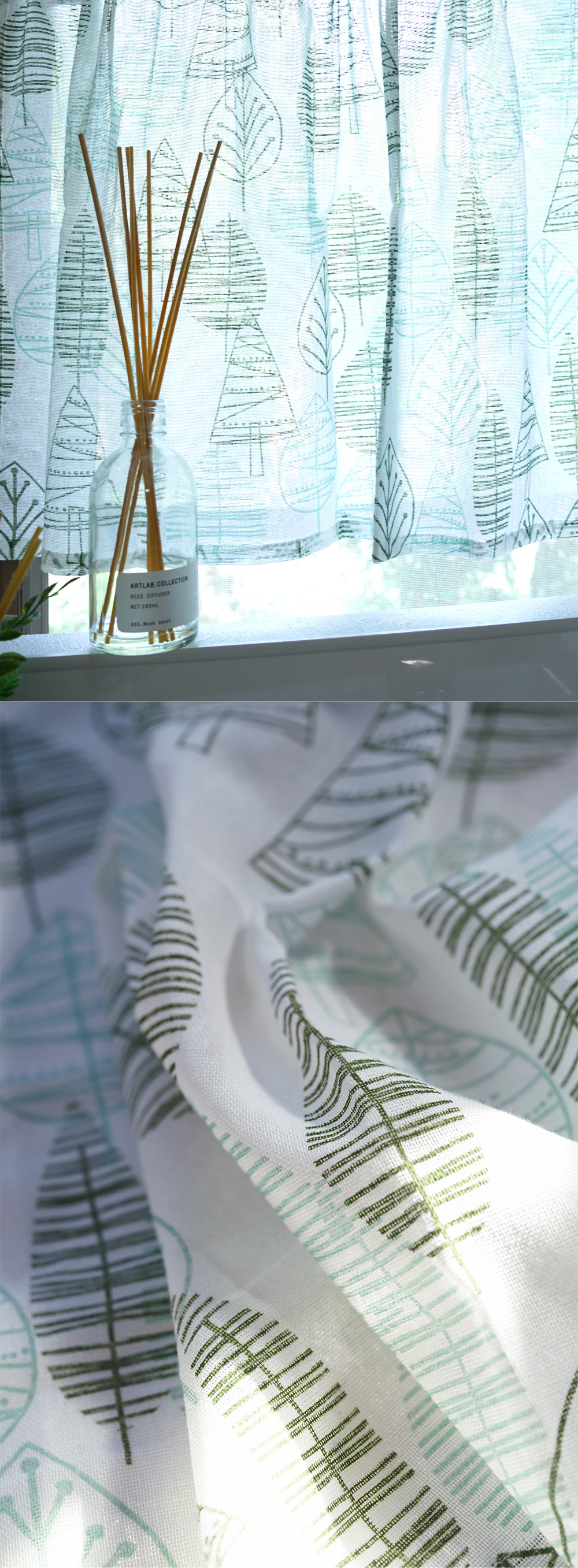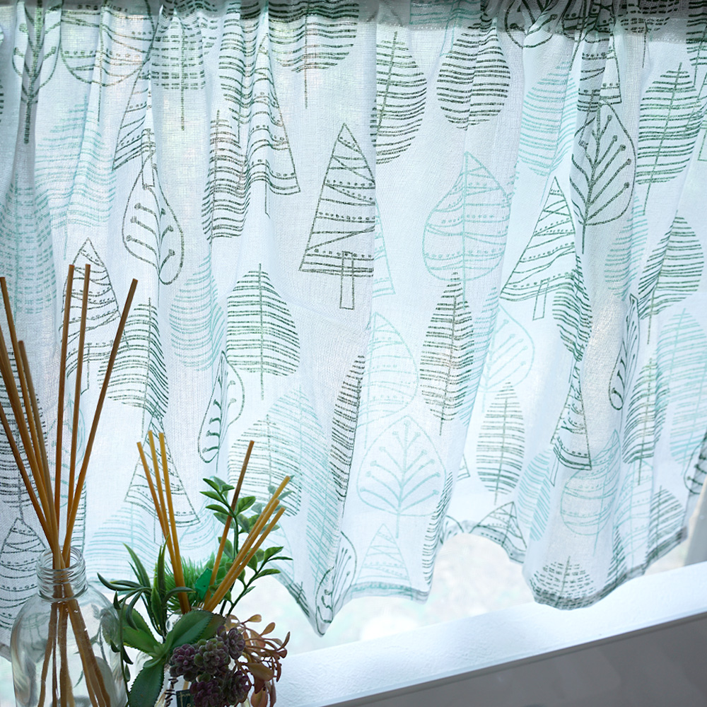 カフェカーテン 北欧 幅100cm×丈45cm 小さめ 1枚 リーフ&木立柄 かわいい 小窓用 目隠し おしゃれ キッチン トイレ 小窓カーテン【リーフ&木立】