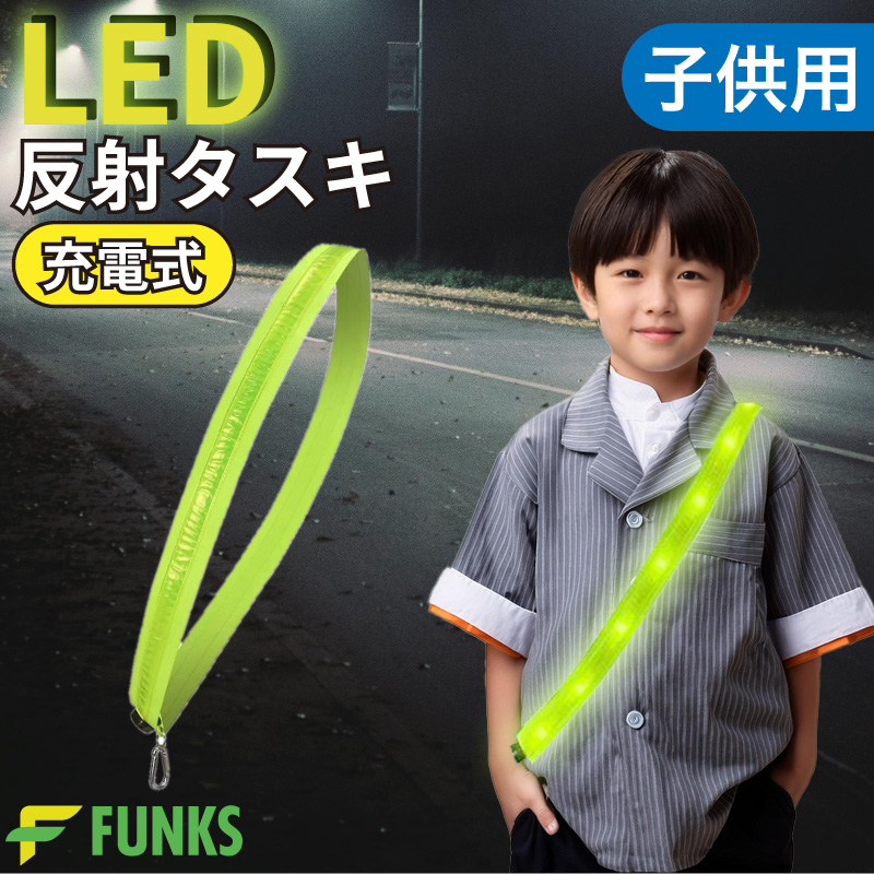 FUNKS 反射 タスキ 子供 led ライト 安全 反射板 蛍光 光る 反射タスキ リフレクター 充電式 夜間 学童 通学
