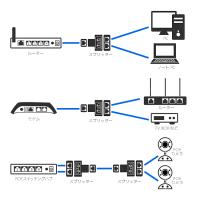 RJ45(LANケーブル)を分岐し2台のデバイスで同時に接続することができるネットワークスプリッターです。